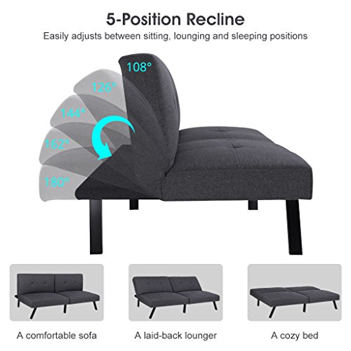 5 POSTION RECLINE: featuring 5 back recline angles with a range of 108°-180°, this futon can be converted between sitting, lounging and sleeping positions with an easy adjust click-clack mechanism; quickly convert it to a laid-back lounger, a comfortable sofa or a cozy bed that is ideal for overnight company