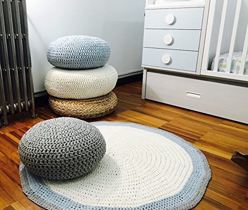 - Made to order - 3/4 weeks to ship this item - Ship it UNSTUFFED, it comes with a insert fabric bag to stuff and the crochet cover - Lovely for your nursery as foot stool to your glider, kids room or living rooms, this crochet pouf is very trendy for your home decor and perfect for a baby boy room. Great to use as floor pillows around the house, also to use as foot rest while nursing, watch TV or as an extra seat. They are sturdy and fun for children to play and sit on them. Three sizes available on options menu, all sizes are without filling. - IMPORTANTE NOTE: ❗️ Pouf is shipped without stuffing to be smaller, lightweighter and cheaper shipping costs. Also for you to be able to choose the stuff you want. ❗️ You can stuff it with polyester fiber, the same stuffing used in regular pillows or shredded foam, feathers, polystyrene beads or with recycled materials as waste fabrics, old duvets... ❗️ You can find the desired filling in various local target stores. Check on my FAQ's where you can buy the filler ❗️ I send instrutions how you can stuff your pouf and all the support you need