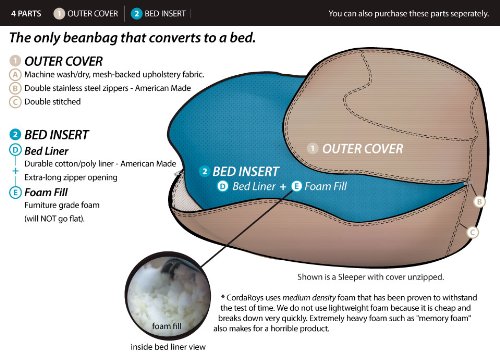 Changeable, Washable & Dryable Cover. Filled with Premium super soft Shredded Foam. (The same foam inside most sofa cushions but shredded. All new. Not recycled!) Sturdy cotton/poly bed with safe-lock zippers. Vacuum-packed for easy transport.