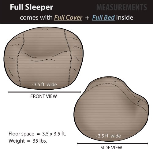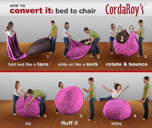 CordaRoy's convertible beanbags are so handy you'll wonder how you ever lived without them. Filled with super-soft and environmentally responsible CertiPUR foam, your CordaRoy's chair will immediately be the favorite seat in your home. Have some unexpected guests who need a place to crash or want to have an amazing sleepover? No problem! Just remove the outer cover from your CordaRoy's beanbag and instantly reveal a foam-filled bed! Throw away your old air mattress and snuggle up on a bed that will never go flat. Top it off with some quilts and blankets to make it extra cozy and comfy. All CordaRoy's products come with a lifetime guarantee so you can rest easy knowing that your investment will last forever. All CordaRoy's covers are changeable and safe for machine wash/dry.CHAIR CONVERTS TO A STANDARD FULL-SIZE BED. A great night's sleep is in the bag.Comes complete with (1) Full Chair Cover and (1) Full Bed insert. Seats 1 Adult 42" Wide. Sleeps 2 Adults. Patented Full Bed inside (54 x 75 x 8)