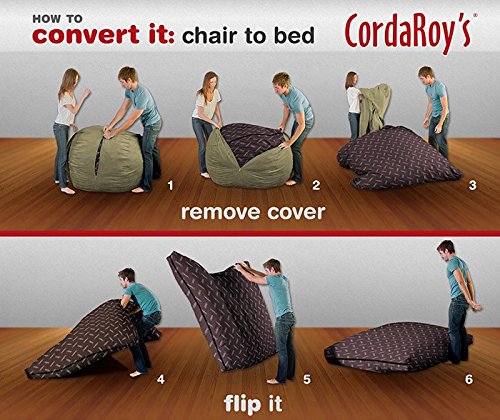 Recommended for ages 10 and under. CHAIR CONVERTS TO A STANDARD TWIN-SIZE BED. A great night's sleep is in the bag. Comes complete with (1) Twin Chair Cover and (1) Twin Bed insert. Seats 1. 32" Wide. Sleeps 1. Patented Twin Bed inside (39 x 75 x 4"). Changeable, Washable & Dryable Cover. Filled with Premium super soft Shredded Foam. Sturdy cotton/poly bed with safe-lock zippers. Vacuum-packed for easy transport.CHAIR CONVERTS TO A STANDARD TWIN-SIZE BED. Recommended for ages 10 and under. A great night's sleep is in the bag.