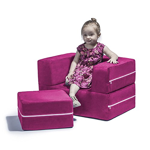 The Zipline Modular Kids Chair with Ottoman is a fun and functional addition to any kid's room. The multifunctional flip design not only offers three different configurations, but is easy enough for any kid to set up on their own. Kids can kick back in the chair form and use the accompanying ottoman to rest their feet after a long day of play. Stack the ottoman inside the chair, and the Zipline becomes a perfect table for games or a comfy stool to perch on. Even better, when the fun is done and it's time to relax, fold out the Zipline completely and spread out on the child-sized lounging platform. The durable and ultra-soft microsuede covers are removable and machine-washable.IMPORTANT: use the "GIFT MESSAGE" at Check-out. Click "this is a gift" in shopping cart, and type the personalization you want embroidered IN THE GIFT MESSAGE. 9 characters max. in length. Embroidery will be Times font lettering in White Thread as shown in image.Innovative modular kids chair with matching ottoman that easily converts into a lounging platform or play table