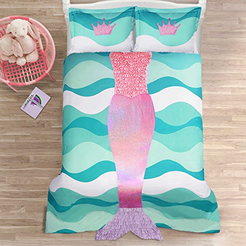 Twin comforter set includes: 68" W x 88" L comforter 20" W x 26" L standard pillow shamSleep like a mermaid with this fun and whimsical design; Ruffled bodice and tail fin add texture and dimension