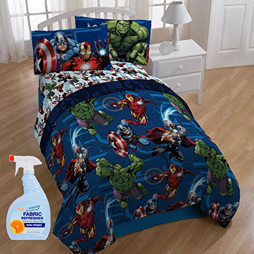 Iron Man and Captain America can assemble in your child's bedroom thanks to the durable and warm Marvel Heroic Age Twin Comforter Set. Along with the superhero-themed comforter, this set also includes coordinating sheets.Twin comforter set includes: 64" W x 86" L comforter; 39" W x 75" L fitted sheet with 10" pocket; 66" W x 96" L flat sheet; 20" W x 30" L pillowcase100% microfiber polyester; Polyester fill