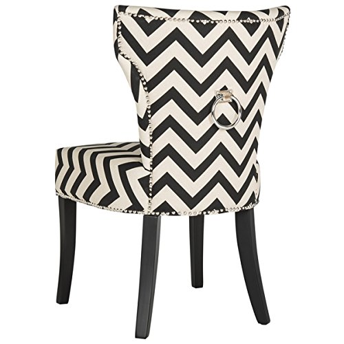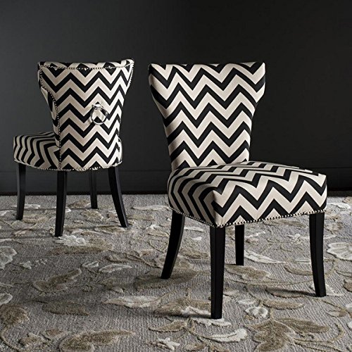 Fashion-forward with a curvaceous silhouette, these Jappic chairs by Safavieh make a bold statement. Featuring black and white chevron upholstery, these chairs are adorned with a glamorous silver ring on the backside for an unexpected modern twist. With plywood legs for a sturdy foundation and a natural cotton-linen blend fabric, these pieces are accented with silver nailheads to provide visual intrigue and quality craftsmanship.Color: Black/White | Includes: Two (2) chairsWood Materials: Plywood | Upholstery: Cotton, Linen