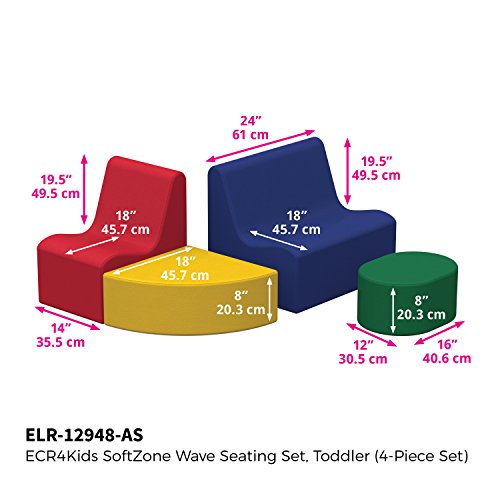 Add a burst of colorful comfort to any space with soft zone WAVE seating! this 4-piece set includes 1 kids' chair, 1 sofa, 1 ottoman and 1 quarter circle table. Use this as a standalone set, or pair it with more WAVE seating to create a customized Lounge or reading nook. With fluid contours and a dense foam core, this Seat makes a comfortable and stylish addition to any space. Captivating colors and sleek curves make these a kids' favorite in bedrooms, playrooms, waiting rooms, libraries and more. The soft leather cover material is durable and easy to maintain — just wipe clean with a mild soap-and-water solution. A non-slip bottom helps keep the wedge safely in place during use. Available in a wide range of colors and in three different sizes: toddler, pre-school and Youth. Toddler size is intended for use by children ages 9 months - 3 years old; pre-school is intended for ages 3 years - 6 years; Youth is intended for ages 6 years and older. Soft zone WAVE seating is GREENGUARD [gold] certified for meeting or exceeding standards for low emissions into indoor air during product usage, and complies with Cal 117 fire safety regulations. With a concentration on the Pre K-12 sector, ECR4Kids offers a wide range of products including classroom tables and chairs, preschool rest time solutions, hardwood storage cases, blocks and manipulative, mobile organizers and a variety of indoor and outdoor play structures.Soft Sitting Area - set of 1 kids' chairs, 1 sofa, 1 ottoman & 1 quarter circle table made with high-density foam and sleek curvesComfortable Contours - designed with ergonomic curves and a supportive backrest for utmost comfort while reading, watching TV or relaxing