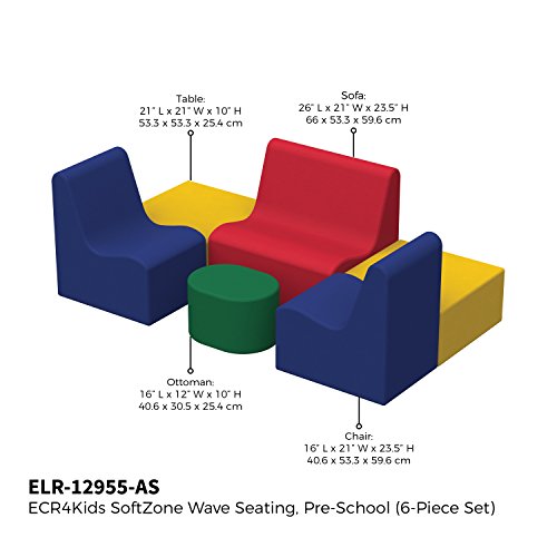 Add a burst of colorful comfort to any space with soft zone WAVE seating! this 6-piece set includes 2 kids' chairs, 1 sofa, 1 ottoman and 2 square tables. Use this as a standalone set, or pair it with more WAVE seating to create a customized Lounge or reading nook. With fluid contours and a dense foam core, this Seat makes a comfortable and stylish addition to any space. Captivating colors and sleek curves make these a kids' favorite in bedrooms, playrooms, waiting rooms, libraries and more. The soft leather cover material is durable and easy to maintain — just wipe clean with a mild soap-and-water solution. A non-slip bottom helps keep the wedge safely in place during use. Available in a wide range of colors and in three different sizes: toddler, pre-school and Youth. Toddler size is intended for use by children ages 9 months - 3 years old; pre-school is intended for ages 3 years - 6 years; Youth is intended for ages 6 years and older. Soft zone WAVE seating is GREENGUARD [gold] certified for meeting or exceeding standards for low emissions into indoor air during product usage, and complies with Cal 117 fire safety regulations. With a concentration on the Pre K-12 sector, ECR4Kids offers a wide range of products including classroom tables and chairs, preschool rest time solutions, hardwood storage cases, blocks and manipulative, mobile organizers and a variety of indoor and outdoor play structures.Soft sitting area - set of 2 kids' chairs, 1 sofa, 1 ottoman & 2 square tables made with high-density foam and sleek curves