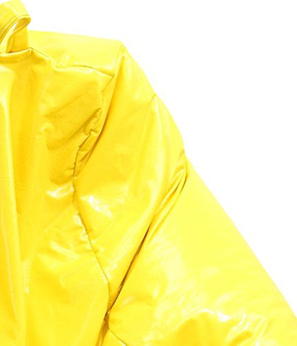 Large tear drop wet look bean bag. 112" circumference (l35" x w34" x h27"). Yellow vinyl cover, double stitched, and has a child safe zipper. Tear drop shape provides extra back support. Durable bean bag has easy wipe down maintenance. Filled with virgin expanded polystyrene beans. Made in USA.112" circumference (l35" x w34" x h27")Sturdy and durable